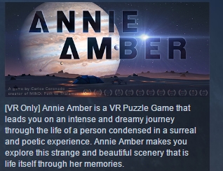 Annie Amber is a VR puzzle game that leads you on an intense and dreamy journey through the life of a person condensed in a surreal and poetic experience. With innovative controls, AA makes you explore this strange and beautiful scenery that is life itself while using your wit to make your way through different memories.