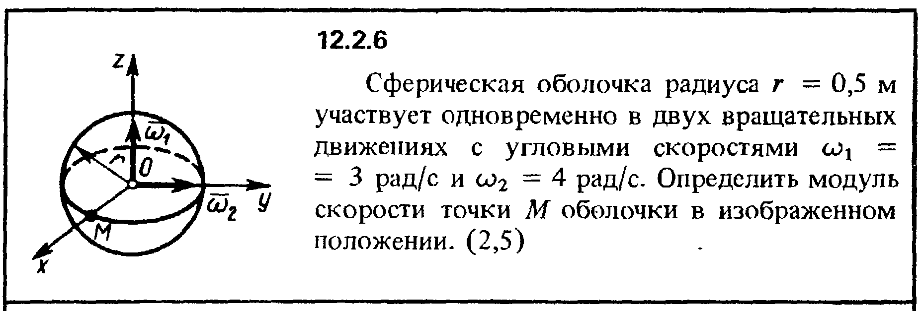 12.2.6 Сферическая оболочка радиуса r = 0,5 м участвует одновременно в двух вращательных движениях с угловыми скоростями ω1 = 3 рад/с и ω2 = 4 рад/с. Определить модуль скорости точки М оболочки в изображенном положении.