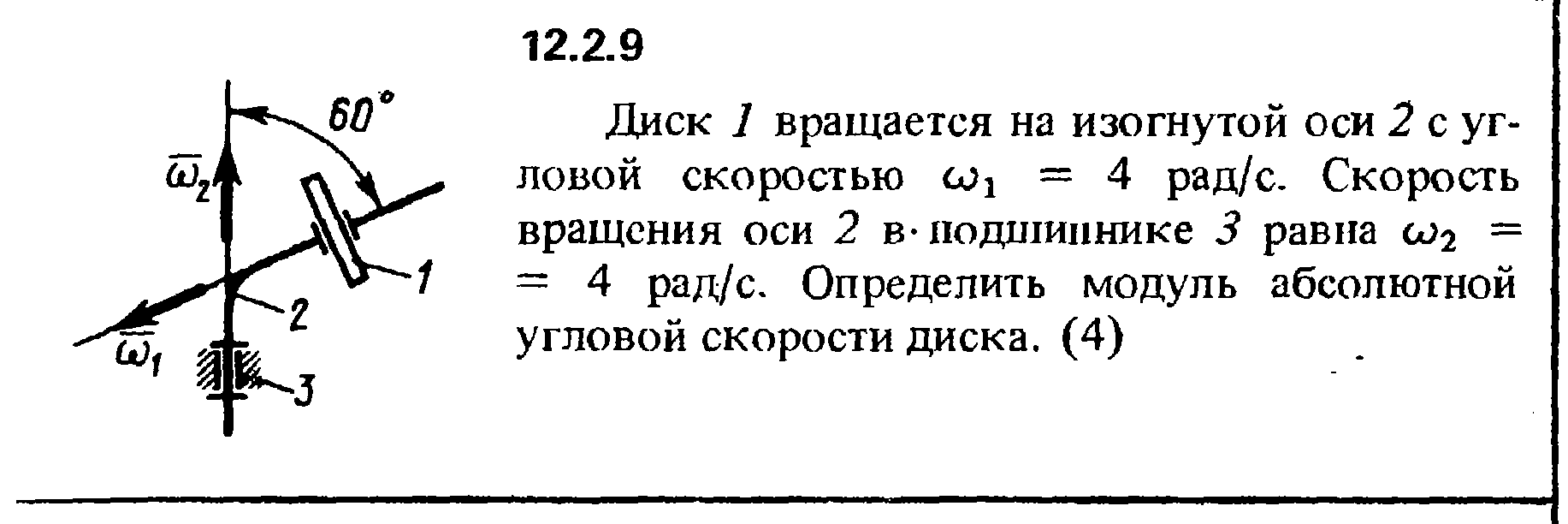 12.2.9 Диск 1 вращается на изогнутой оси 2 с угловой скоростью ω1 = 4 рад/с. Скорость вращения оси 2 в подшипнике 3 равна ω2 = 4 рад/с. Определить модуль абсолютной угловой скорости диска.