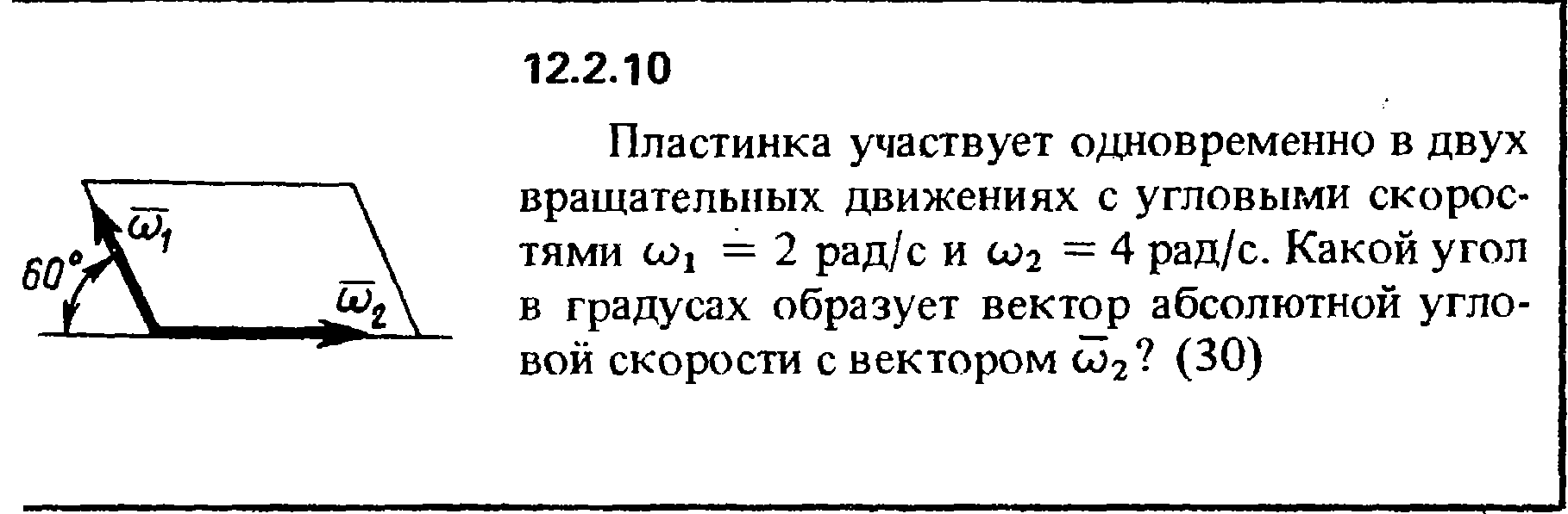 12.2.10 Пластинка участвует одновременно в двух вращательных движениях с угловыми скоростями ω1 = 2 рад/с ω2 = 4 рад/с. Какой угол в градусах образует вектор абсолютной угловой скорости с вектором ω2?