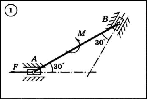 Для представленного на схеме механизма, расположенного в вертикальной плоскости, определить значение силы F из условия равновесия механизмов. Механизм состоит из однородного тонкого стержня AB длиной l = 4 м и весом G = 15 кН и двух невесомых ползунов А и B, которые могут перемещаться по направляющим. На стержень действует сила с моментом M = 20кНм. Трение у ползуна B отсутствует, коэффициент трения ползуна A по направляющей f = 0,4. Размерами ползунов пренебречь.
