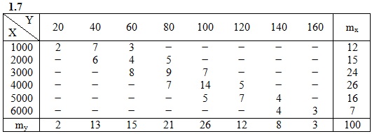 Дана таблица распределения 100 заводов по производственным средствам X(тыс. ден. ед.) и по суточной выработке Y(т). Известно, что между X и Y существует линейная корреляционная зависимость. Требуется:
