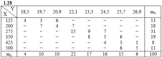 Дана таблица распределения 100 заводов по производственным средствам X(тыс. ден. ед.) и по суточной выработке Y(т). Известно, что между X и Y существует линейная корреляционная зависимость. Требуется: