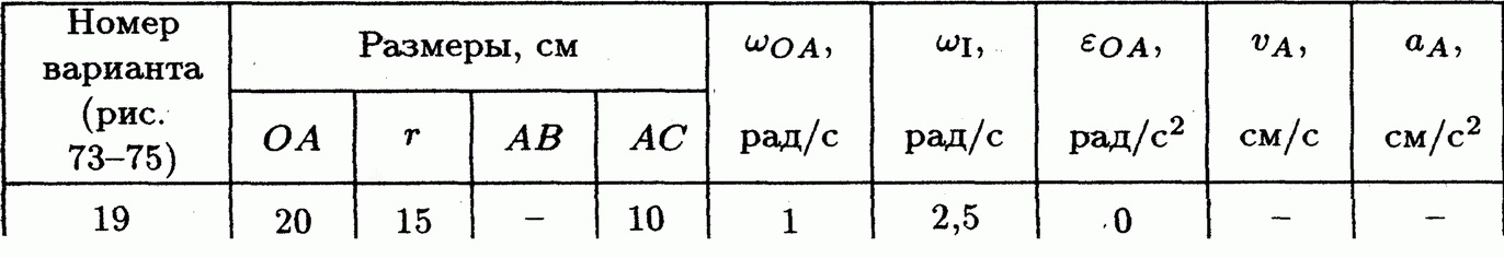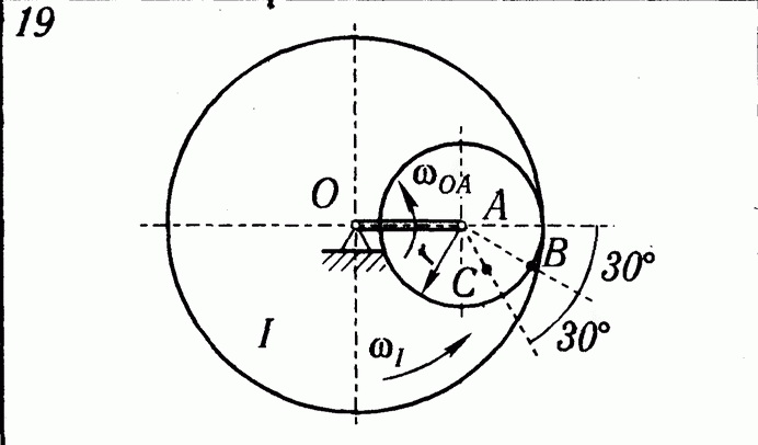Решение задачи К5 Вариант 19 из решебника по теоретической механике Яблонский А.А. 1978 г., на тему: К5 Определение скоростей и ускорении точек твердого тела при плоском движении (стр. 99).