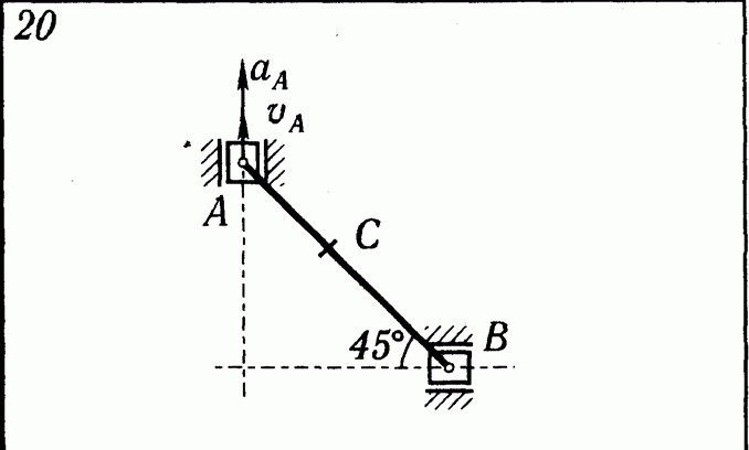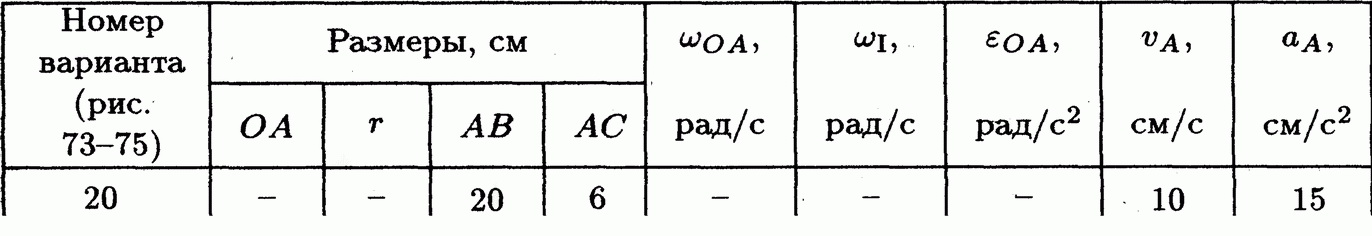 Решение задачи К5 Вариант 20 из решебника по теоретической механике Яблонский А.А. 1978 г., на тему: К5 Определение скоростей и ускорении точек твердого тела при плоском движении (стр. 99).