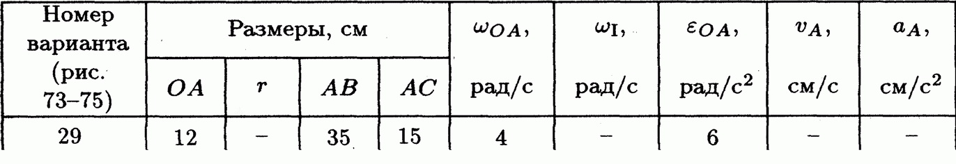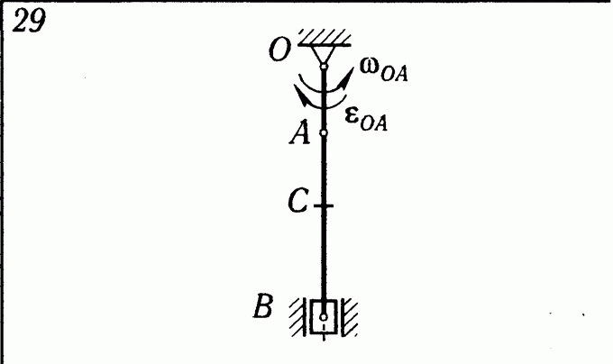 Решение задачи К5 Вариант 29 из решебника по теоретической механике Яблонский А.А. 1978 г., на тему: К5 Определение скоростей и ускорении точек твердого тела при плоском движении (стр. 99).