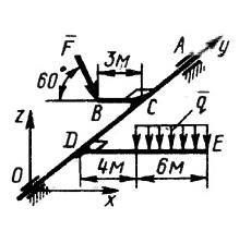К валу ОА под прямым углом прикреп­лены стержни ВС и DE. К стержню DE приложе­на распределенная нагрузка q = 0,5 Н/м. Опре­делить модуль силы F, уравновешивающей данную нагрузку, если F || Oxz. (Ответ 8,08)