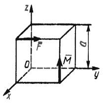 На куб с ребром а = 2 м действует сила F = 0,5 кН и пара сил с моментом М = 5 кН•м. Определить главный момент в кН•м данной системы сил, приняв за центр приведения точку О.