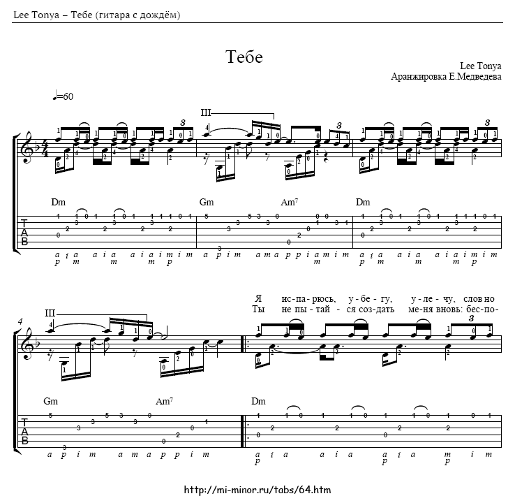 Аранжировка песни Lee Tonya – Тебе (Гитара с дождём) для одной гитары.