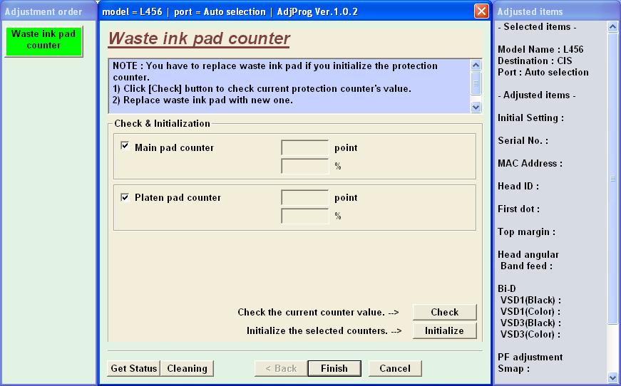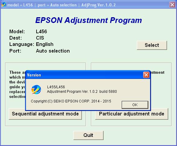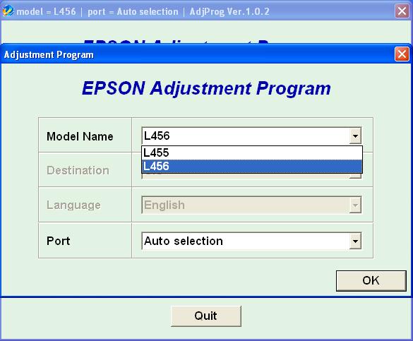 Adjustment program Epson L455, L456 (EURO, CIS) Ver.1.0.2 - это сервисная программа для указанных моделей принтеров, программа позволяет сбросить счетчик памперса (отрботка, абсорбер), прописывать ID печатающей головки, делать инициализацию принтера и другие функции.