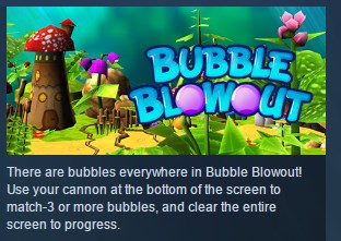 There are bubbles everywhere in Bubble Blowout! Use your cannon at the bottom of the screen to match-3 or more bubbles, and clear the entire screen to progress. The more bubbles you burst at once the higher score and better bonus you will get. Suitable to players of all ages and experience levels, this crisp and colorful bubble-blaster offers multiple modes of play. RELAX mode is ideal to introductory players seeking a laid-back and casual gameplay experience. CLASSIC mode has 21 exciting levels to beat, and only experienced players will achieve top-star ratings across all levels. RUSH mode is a match made in heaven to expert players going for the highest score in a fun bubble parade that never ends.