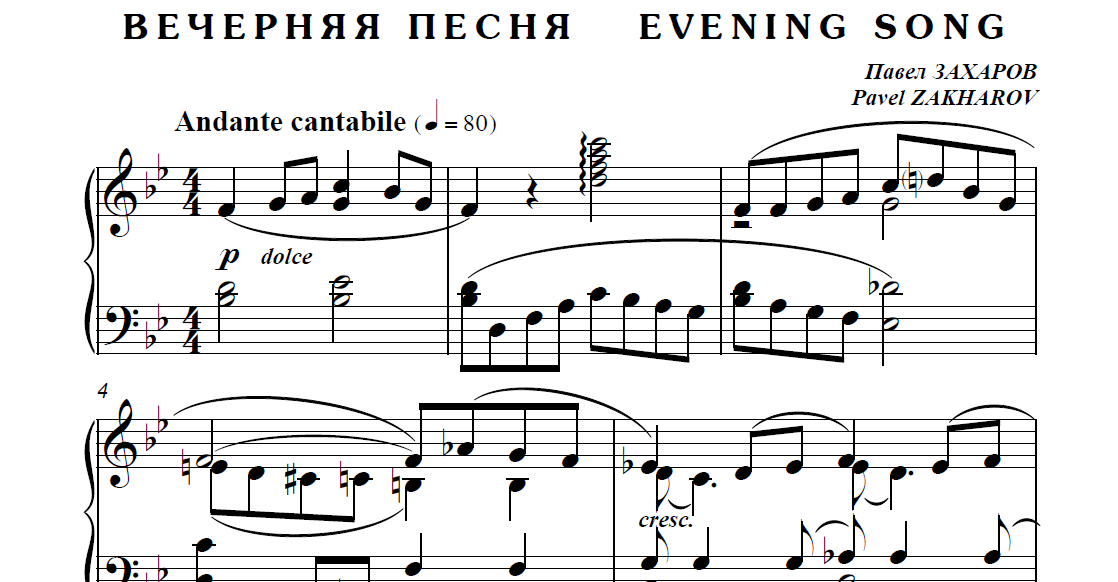 "Вечерняя песня" для фортепиано, ноты,