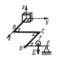 Горизонтальный стержень DE, на кото­ром установлен груз весом G = 5 кН, в точке D опирается на горизонтальный изогнутый стержень ABCD. Определить в кН•м проек­цию на ось х момента в заделке А, если разме­ры АВ = ВС = CD = 2м, DF = FE. (Ответ 5)