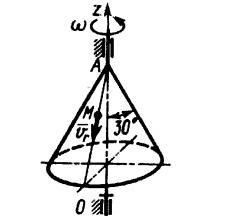 Конус, по образующей которого движется точка М согласно уравнению AM = 2t, враща­ется вокруг оси Oz по закону φ = 4 sin 0,4t. Оп­ределить модуль переносной скорости точки М в момент времени t = 2 с. (Ответ 2,19)