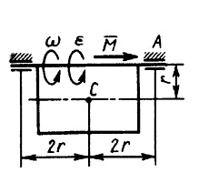 Однородное цилиндрическое тело массой m = 10 кг вращается под действием пары сил с моментом М. Определить модуль динамичес­кой нагрузки на подшипник А в момент вре­мени, когда угловая скорость ω = 5 рад/с, угловое ускорение ϵ = 50 рад/с2. Точка С - центр масс тела, размер r = 0,2 м. (Ответ 55,9)