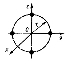 Определить момент инерции относительно плоскости Оху механической системы, состоя­щей из четырех одинаковых материальных точек, если масса каждой точки m = 1,5 кг, а радиус r = 0,4 м. (Ответ 0,48)
