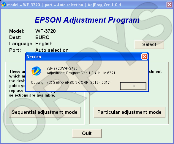 Epson WF-3720, WF-3725 (EURO) Ver.1.0.4 Service Adjustment Program — это сервисная программа для указанных моделей принтеров, программа позволяет сбросить счетчик памперса [счетчик подкладки отработанных чернил], прописывать ID печатающей головки, делать инициализацию принтера и другие функции.