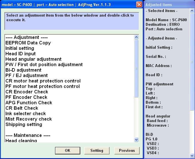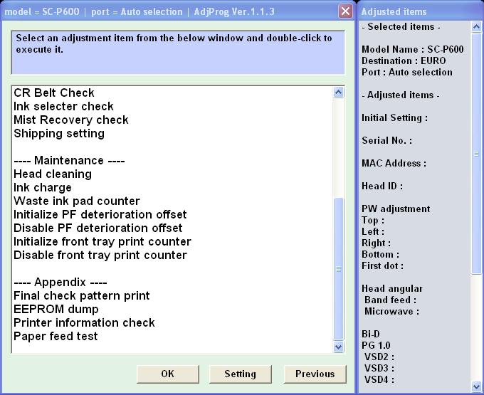 Epson Sure Color SC-P600 (EURO) Ver.1.1.3 Service Adjustment Program — это сервисная программа для указанных моделей принтеров, программа позволяет сбросить счетчик памперса (отрботка, абсорбер), прописывать ID печатающей головки, делать инициализацию принтера и другие функции.