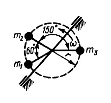 К валу, который вращается с постоянной угловой скоростью ω, прикреплены три точеч­ных груза, расположенных в плоскости, пер­пендикулярной оси вращения. Чему должна быть равна масса m3, чтобы динамические реакции подшипников были равны нулю, если массы m1 = m2 = 2 кг. (Ответ 3,46)