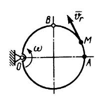 По ободу диска, вращающегося в плоскос­ти чертежа с угловой скоростью ω = 2 рад/с, движется точка М с относительной скоростью vr = 0,2 м/с. Изменится ли модуль ускорения Кориолиса точки М при переходе ее из А в В? (Ответ Нет)