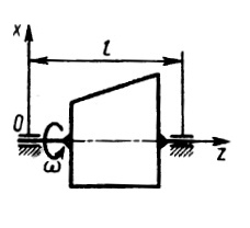 Тонкая пластина вращается с постоянной угловой скоростью ω = 60 рад/с. Еe центр масс расположен на оси вращения, а центро­бежный момент инерции относительно коорди­натных осей в плоскости пластины IХZ = 2 • 10-3 кг•м2. Определить динамическую реакцию подшипника О, если l = 0,2 м. (Ответ 36)