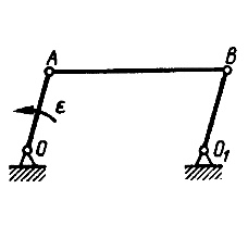 Кривошип ОА длиной 0,1 м шарнирного параллелограмма ОАВО1 начинает вращаться из состояния покоя с постоянным угловым ускорением ϵ = 2 рад/с2. Определить модуль равнодействующей сил инерции стержня АВ массой 2 кг в момент времени t = 1с. (Ответ 0,894)