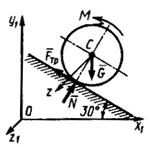 По наклонной плоскости перемещается ци­линдр массой m = 300 кг и радиуса R = 0,15 м. К цилиндру приложена пара сил с моментом М = 75 H • м. Определить модуль углового ускорения цилиндра, если его момент инерции ICz = 3,4 кг • м2, а сила трения Fтр = 255 Н. (Ответ 10,9)
