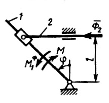 Кулисный механизм расположен в гори­зонтальной плоскости. Определить момент М пары сил, действующей на кривошип 1, если в момент времени, когда угол φ = 45°, глав­ный момент сил инерции кривошипа М1Ф = 0,1 Н • м, главный вектор сил инерции ку­лисы Ф2 = 1Н, расстояние l = 0,1 м. (Ответ 0,3)