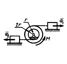 Определить модуль момента М пары сил, действующей на барабан, если силы инерции тел Ф1 = 2Н, Ф2 = 1Н, радиус r = 0,1 м, (Ответ 0,5)