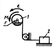Определить модуль постоянного момента М пары сил, если угловое ускорение барабана ϵ = 1 рад/с2, массы тел m1 = m2 = 1 кг, радиус r = 0,2 м, барабан 1 считать однородным ци­линдром. (Ответ 0,06)