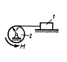 Определить модуль момента М пары сил, если тело 1 массой 1 кг движется с постоян­ным ускорением 1 м/с2. Момент инерции бара­бана 2 относительно оси вращения I2 = 0,1 кг • м2, радиус r = 0,1 м. (Ответ 1,1)