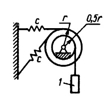 Определить период свободных вертикаль­ных колебаний груза 1, если его масса m = 4 кг, коэффициент жесткости каждой пру­жины с = 100 Н/м, радиус r = 0,2 м. (Ответ 0,446)