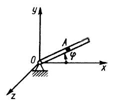 В трубке, вращающейся по закону φ = 4t вокруг оси Oz, движется шарик по за­кону ОА = 5t2. Определить координату хА шарика в момент времени t = 0,25 с. (Ответ 0,169)