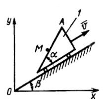 Тело 1 движется по наклонной плоскости равномерно со скоростью v = 2 м/с. Точка М относительно тела 1 движется согласно урав­нению AM = 0,5t. Определить координату хм точки М в момент времени t = 2 с, если при t = 0 координата хм = 0, углы α = β = 30°. (Ответ 2,96)