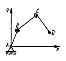 Материальные точки А, В, С и D соединены между собой невесомыми жесткими стерж­нями постоянной длины. Точка А неподвижна, а точки В, С и D движутся в плоскости Аху. Определить число степеней свободы системы материальных точек. (Ответ 3)