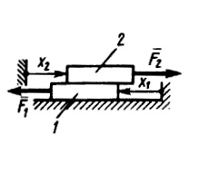 На пластины 1 и 2, массы которых m1 = m2 = 10 кг, действуют сизгы F1 = 50Н и F2 = 30Н. Определить обобщенную силу, соответствующую координате х1, если коэф­фициент трения скольжения между всеми по­верхностями f = 0,15. (Ответ 5,86)