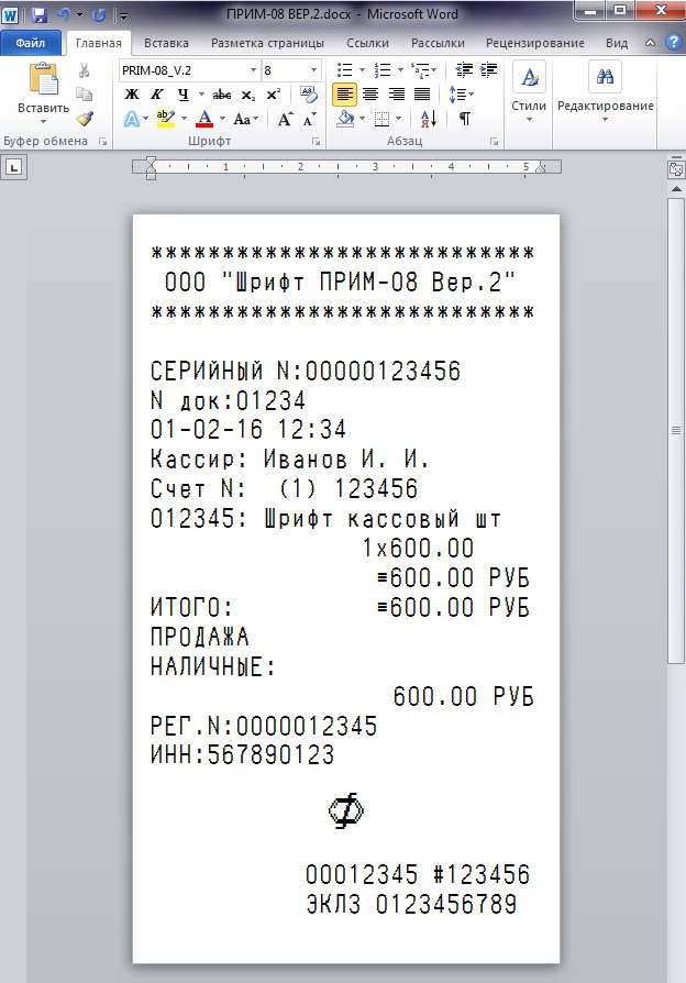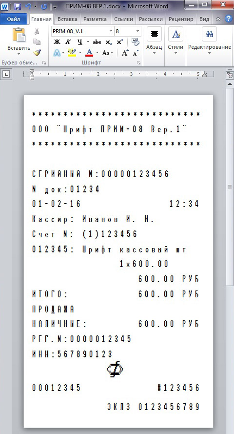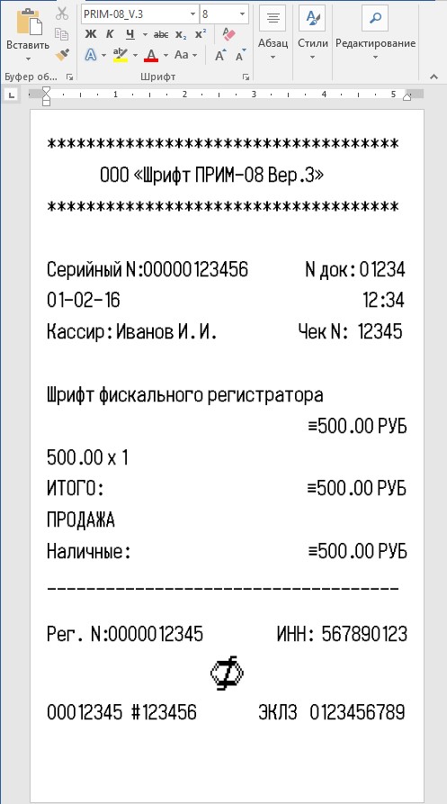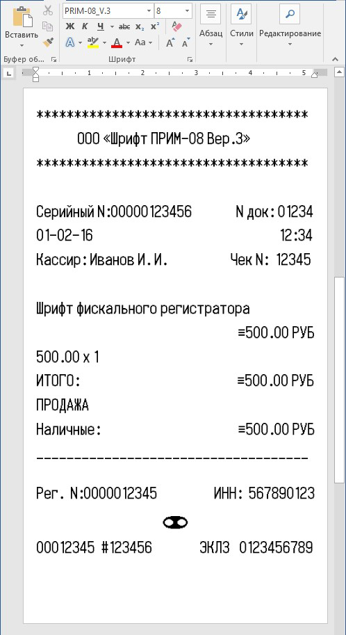Данный полный набор шрифтов кассового аппарата ПРИМ-08 содержит все 3 версии шрифтов в формате TTF (русские и английские буквы) для использования в программе Microsoft Word. В архиве находятся шрифты в формате TTF и шаблоны вариантов чеков. Зачастую магазины используют в одном чеке несколько видов шрифтов с целью защиты чека от подделки. Данный набор позволит Вам повторить любой чек, напечатанный на данном аппарате. Вам остается только установить шрифты в систему (обычно C:\WINDOWS\Fonts), открыть шаблон и начать редактирование. Печатать чеки предпочтительно на термопринтере, на кассовой термоленте. Хотя можно печатать и на струйнике и лазерном, с возможностью вывода на факсовую бумагу. Лучшее качество, естественно, при печати на термопринтерах.