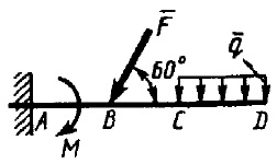 К балке AD приложена пара сил с моментом М = 200 Н*м, распределенная нагрузка интенсивностью q = 20 Н/м и сила F. Какой должна быть эта сила, для того чтобы момент в заделке А равнялся 650 Н*м, если размеры АВ = ВС = CD = 2 м?