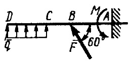 Определить интенсивность q распределенной нагрузки, при которой момент в заделке А равен 546 Н*м, если сила F = 173 Н, момент пары сил М = 42 Н*м, размеры АВ = СD = 2м, ВС= 1 м.