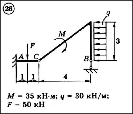 Для представленной на схеме составной конструкции найти реакции опор используя принцип возможных скоростей или принцип возможных перемещений Лагранжа. Размеры указаны в метрах. Весом элементов конструкции пренебречь.