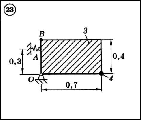 Для приведенной на схеме механической системы определить собственную частоту колебаний. Механическая система, показанная на схеме в положении равновесия, может совершать свободные колебания, вращаясь вокруг горизонтальной оси z, проходящей через неподвижную точку O. Система состоит из жестко скрепленных друг с другом тел: тонких однородных стержней 1 и 2 или однородной пластины 3 и точечного груза 4. Масса 1 м длины стержней равна 25 кг, масса 1 м2 площади пластины - 50 кг, масса точечного груза - 20 кг. Упругие элементы имеют коэффициент жесткости c = 10кН/м. Размеры частей системы указаны в метрах.