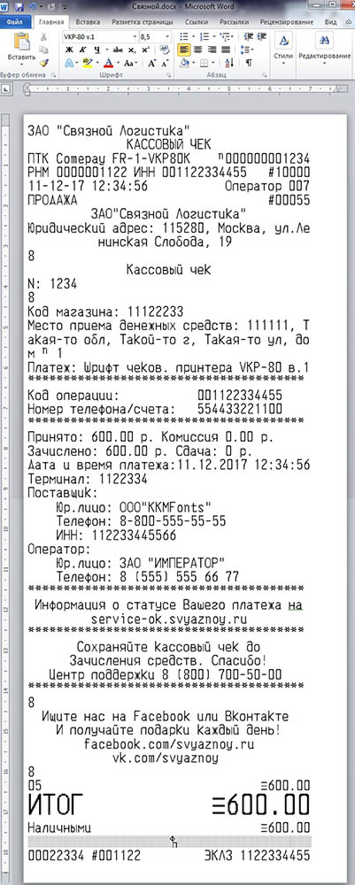 Шрифт чекового принтера VKP-80(версия 1), который устанавливается во многие терминалы оплаты, в частности СВЯЗНОЙ в формате OTF (русские и английские буквы) для использования в программе Microsoft Word. В архиве находятся шрифт в формате OTF и шаблон чека. Вам остается только установить шрифт в систему (обычно C:\WINDOWS\Fonts), открыть шаблон и начать редактирование.