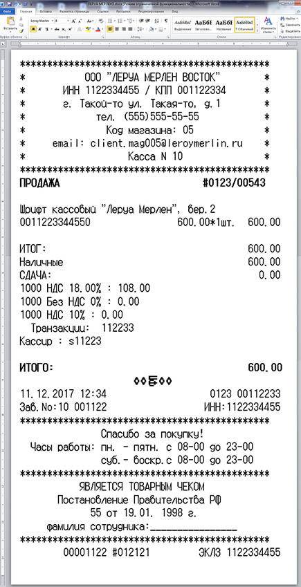 Шрифты одного из вариантов кассового аппарата ЛЕРУА МЕРЛЕН в формате TTF и OTF (русские и английские буквы) для использования в программе Microsoft Word. В архиве находятся шрифты в формате TTF и OTF(на выбор) и шаблон чека. Вам остается только установить шрифты в систему (обычно C:\WINDOWS\Fonts), открыть шаблон и начать редактирование. Печатать чеки предпочтительно на термопринтере, на кассовой термоленте. Хотя можно печатать и на струйнике и лазерном, с возможностью вывода на факсовую бумагу. Лучшее качество, естественно, при печати на термопринтерах.