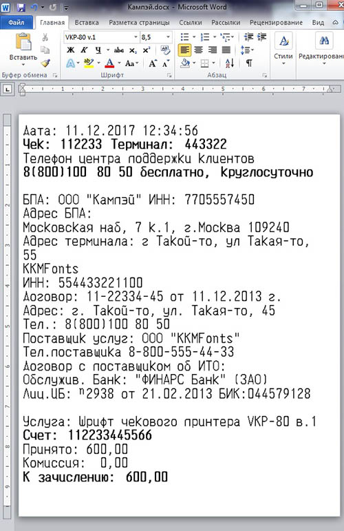 Шрифт чекового принтера VKP-80(версия 1), который устанавливается во многие терминалы оплаты, в частности КАМПЭЙ в формате OTF (русские и английские буквы) для использования в программе Microsoft Word. В архиве находятся шрифт в формате OTF и шаблон чека. Вам остается только установить шрифт в систему (обычно C:\WINDOWS\Fonts), открыть шаблон и начать редактирование.