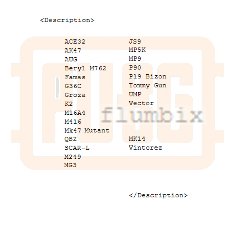 ACE32, АК47, Beryl M762, Groza, Mk47 Mutant, AUG, M16A4, M416, SCAR-L, QBZ, G36C, K2, Famas;