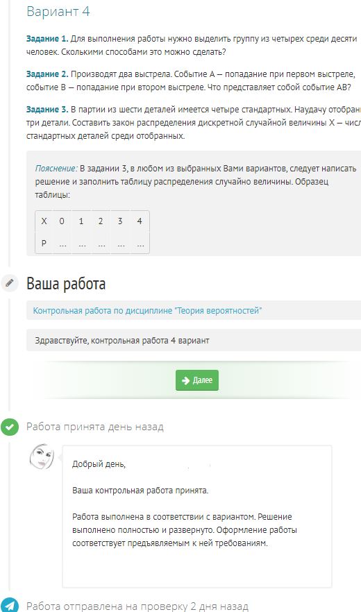 Пояснение: В задании 3, в любом из выбранных Вами вариантов, следует написать решение и заполнить таблицу распределения случайно величины. Образец таблицы: