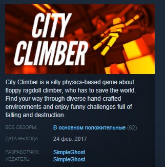 City Climber is a silly physics-based game about floppy ragdoll climber, who has to save the world. Find your way through diverse hand-crafted environments and enjoy funny challenges full of falling and destruction.