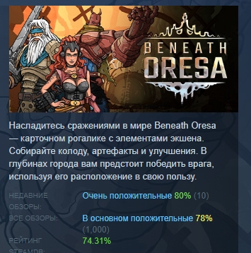Beneath Oresa — это карточное приключение в стиле «рогалик». Сражайтесь с врагами на тактических аренах. Собирайте колоду, артефакты и улучшения с умом. Держитесь на расстоянии от врагов, нападайте в подходящий момент и используйте их расположение в свою пользу. Вас ждут множество фракций, герои с уникальными способностями, ежедневные задания, чудеса игровой механики и многое другое. Пошаговая стратегия проведёт вас по закоулкам Оресы.