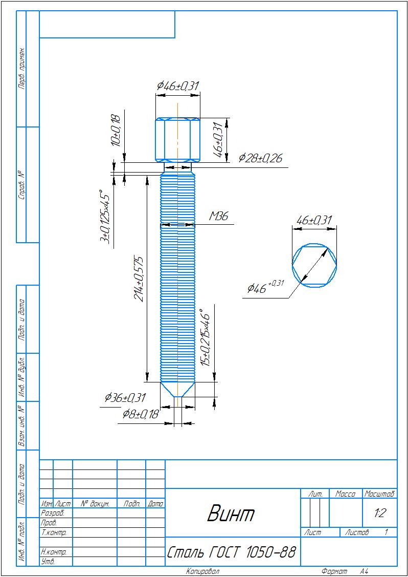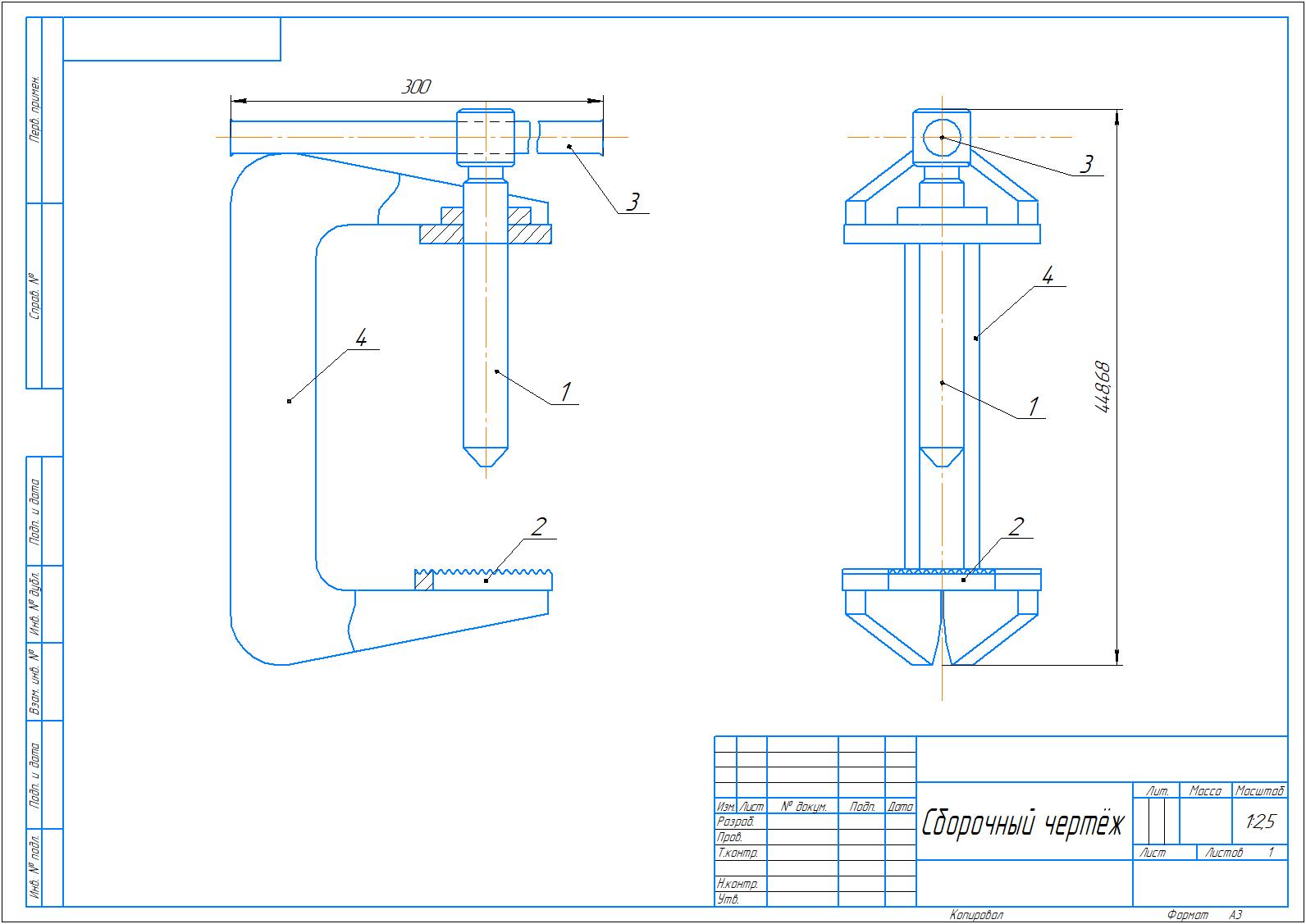 Чертёж съёмника крестовин карданных валов в формате А3 в 2х видах, и чертёж детали с указанием марки стали на формате А4 в 2х видах. Выполнено всё в КОМПАС 3D v17.