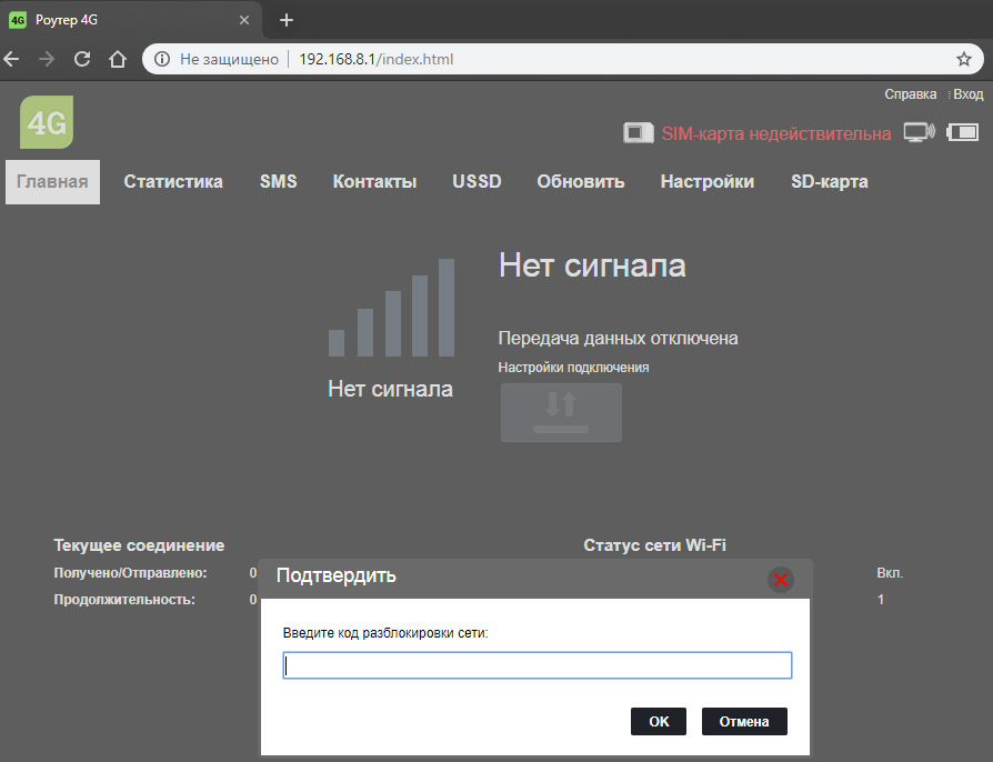 2. Вставьте в устройство SIM карту другого оператора и войдите в web-интерфейс на страницу разблокировки устройства .